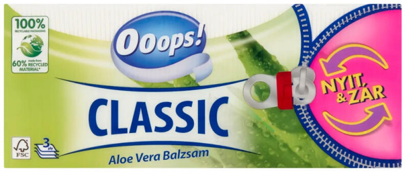 Aloe vera illatú, háromrtg. ű Ooops! Classic papír zsebkendő nyitó-záró füllel rendelkezik, egyszerűbbé téve a mindennapi használatot.