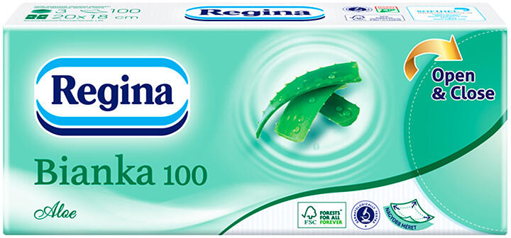 A Regina Bianka termékcsalád selymesen puha, prémium papír zsebkendői kitűnő minőségű, tiszta cellulóz felhasználásával készülnek. A Bianka Aloe zsebkendő alkoholmentes illatanyagot tartalmaz, így kíméletes minden bőrtípushoz.
