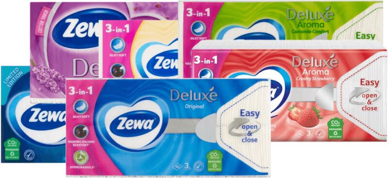A kényeztető puhaságú, ugyanakkor erős, háromrétegű Zewa Deluxe papírzsebkendő 6 féle illatban megtalálható nálunk. A könnyen nyitható és visszazárható csomagolás még kényelmesebbé teszi a használatát! Kiszerelés 90 db Illat: Classic, kamilla, eper, levendula álom, spirit of tea, winter magic. Válaszd a kedvencedet!