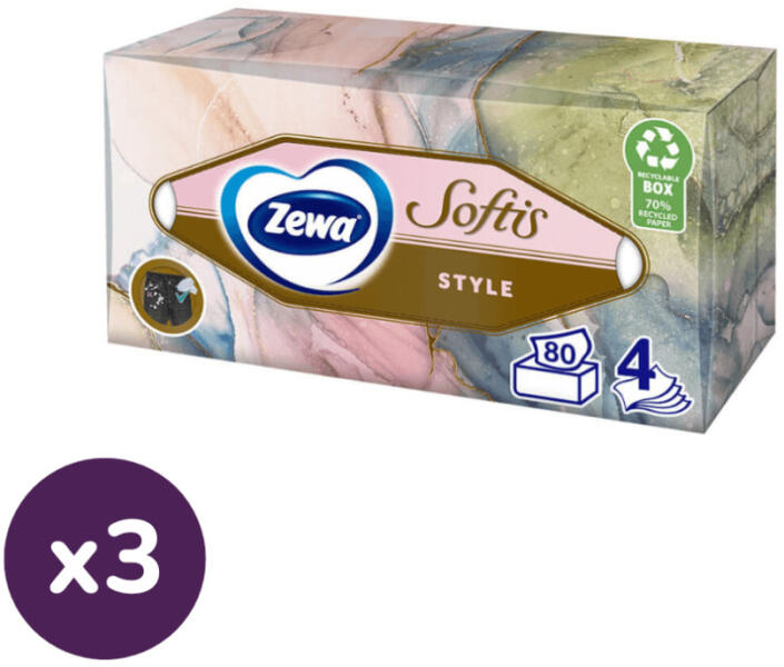 Zewa Softis Style 4 rétegű illatmentes dobozos papírzsebkendő (3x80 db)